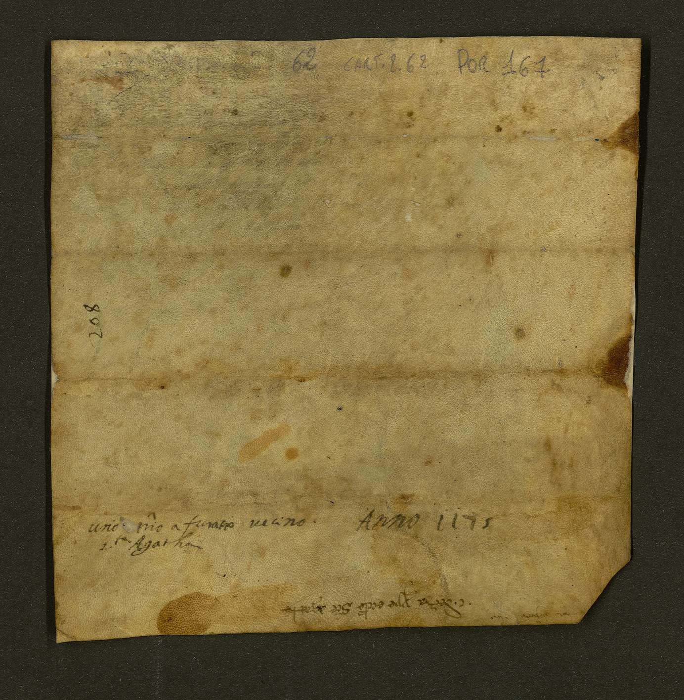 Giovanni Serviente, figlio del fu Urso, vende a Campanino, figlio del fu Gualtiero Fellecluso, per 17 tarì d’oro un pezzo di terra alla località Furano nei pressi della chiesa di S. Agata con l’obbligo di versare la decima del terratico alla Curia. Guglielmo, notaio.