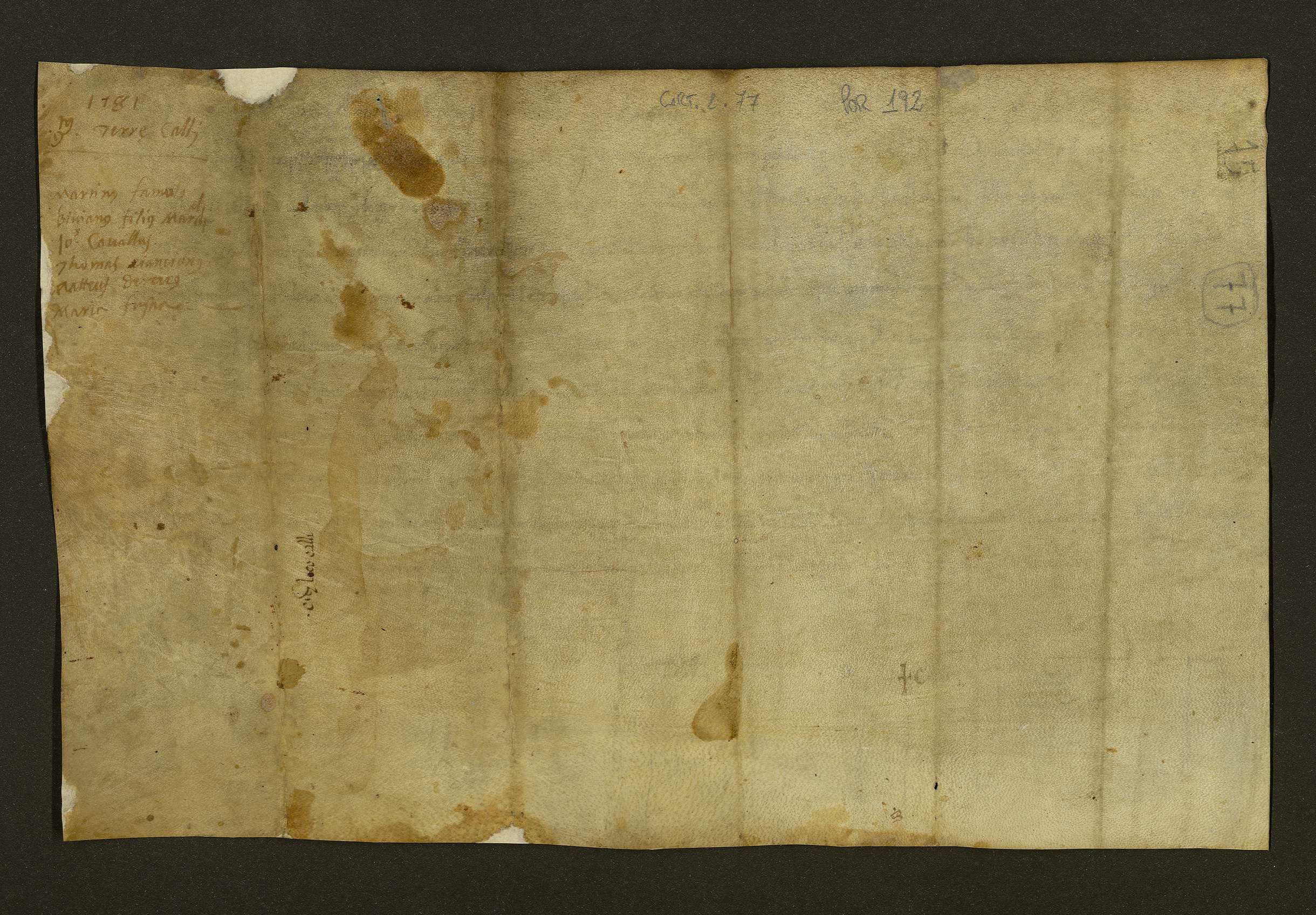 Con il consenso delle rispettive mogli Maria e Fusca, Martino e il genero Pandolo, vendono a Giovanni e Pietro, figli del fu Ruggiero, una terra laboratoria alla località Calli per 24 tarì di Saleno. Simone, notaio.