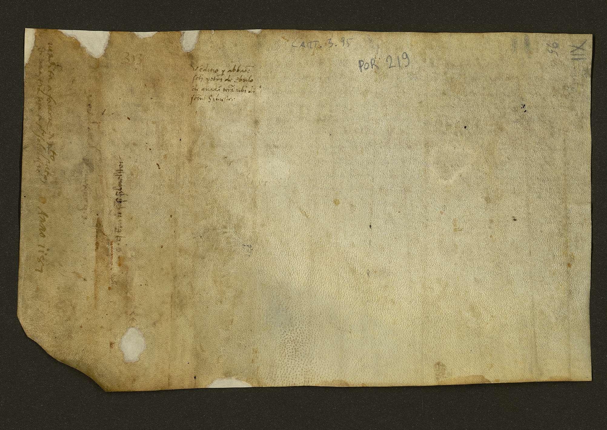 Guglielmo abate del monastero di S. Pietro vende ad Andrea, figlio del fu Pietro Porcaro, un pezzo di terra con vigna alla località S. Silvestro per 12 tarì di Salerno. L’acquirente si obbliga a versare al monastero ogni anno nella festività di S. Pietro di giugno un censo di ricognizione di 2 once di Olevano e, in caso di vendita, riserva al monastero il diritto di prelazione per un prezzo scontato di 4 tarì. Nel caso in cui la terra debba essere venduta a terzi vengono riservati allo stesso monastero 4 tarì e il censo suddetto. Abele, notaio.