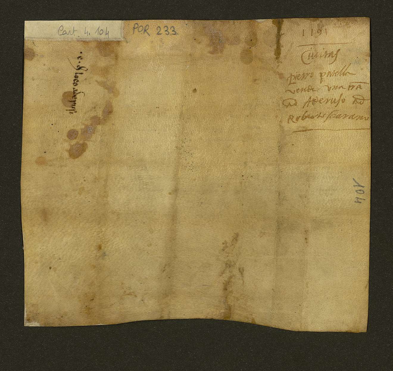 Con il consenso della moglie Amata, Pietro Patella figlio del fu Maraldo vende a Ruggiero, figlio di Guglielmo Scarano, la quarta parte di una terra alberata alla località Odorosa di Furano per 16 tarì d’oro. Riccardo, notaio.