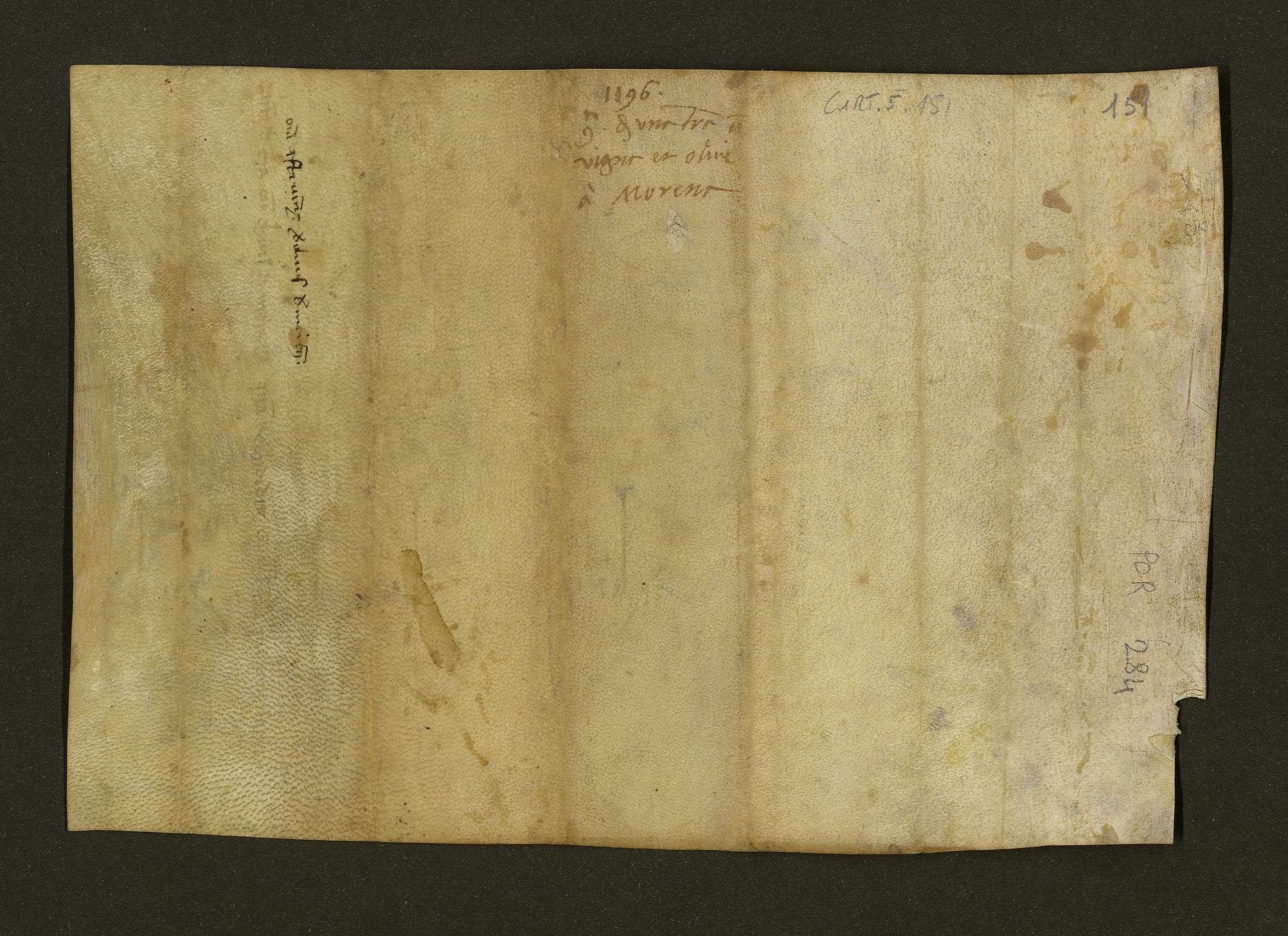 Guglielmo, del fu fabbro Martino, vende a Guido, figlio del fu notaio Guido, per 54 tarì di Salerno una terra con olivi alla località Moreno al confine con i beni di Andrea di Montecorvino. Pietro, notaio.