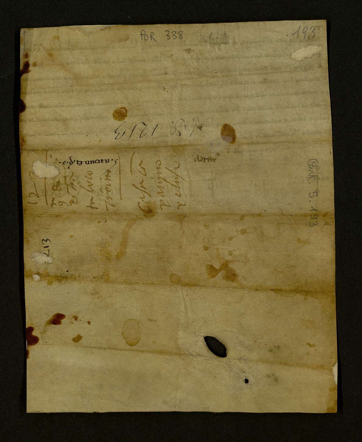 Per la remissione dei suoi peccati e per la salvezza delle anime dei genitori, Andrea figlio del fu Campanino Piloso offre a Dio e alla chiesa di S. Giacomo degli Eremiti nelle mani del priore Guglielmo la metà di una terra alla località Troncito di Furano, fatto salvo il terratico spettante al milite Ruggiero di Nicola, e la metà degli olivi esistenti nella predetta terra. Ruggiero, notaio.