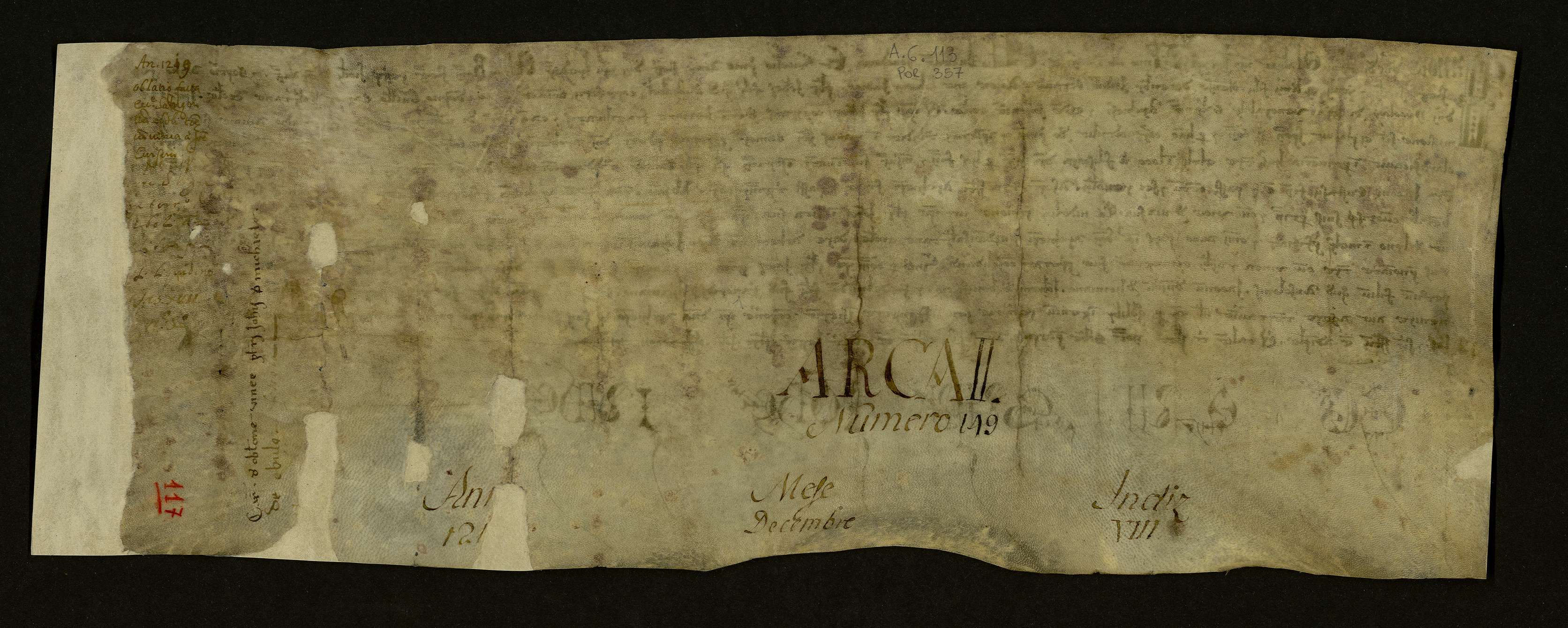 Strumento con il quale il presbitero Giovanni di Michele Corvisiero lascia a Nicola Arcivescovo di Salerno una terra con vigna ed alberi nei pressi di Eboli in contrada Liscaro. Pietro, notaio