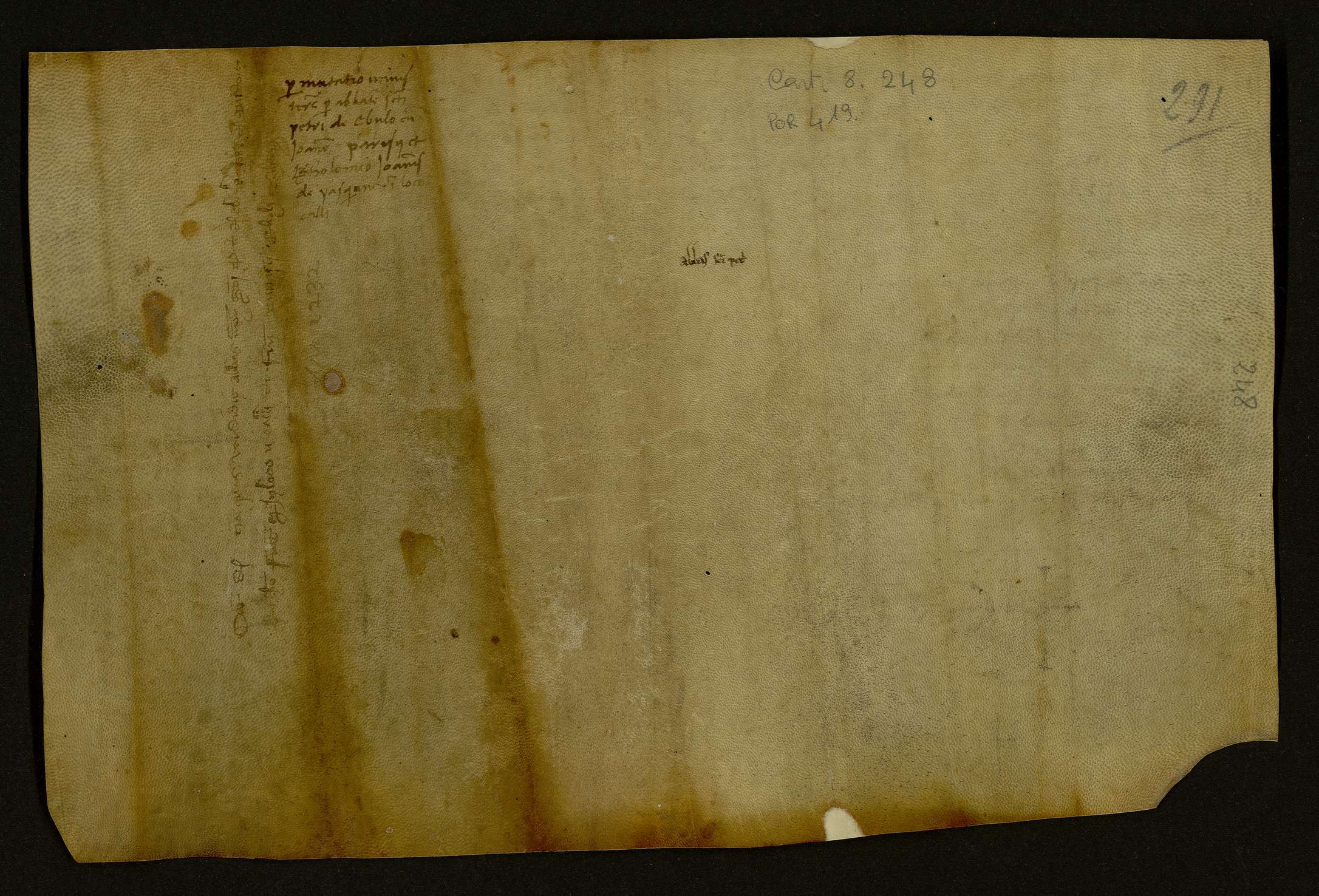 Con il consenso dei confratelli, Guglielmo abate del monastero di S. Pietro dà a Giovanni, figlio del fu Parisio, e al genero di questi, Bartolomeo figlio del fu Giovanni di Pasquiana, una terra laboratoria alla località Calli, confinante con il torrente Ausella, e in cambio riceve un’altra terra laboratoria alla località Prato. Pietro, notaio.
