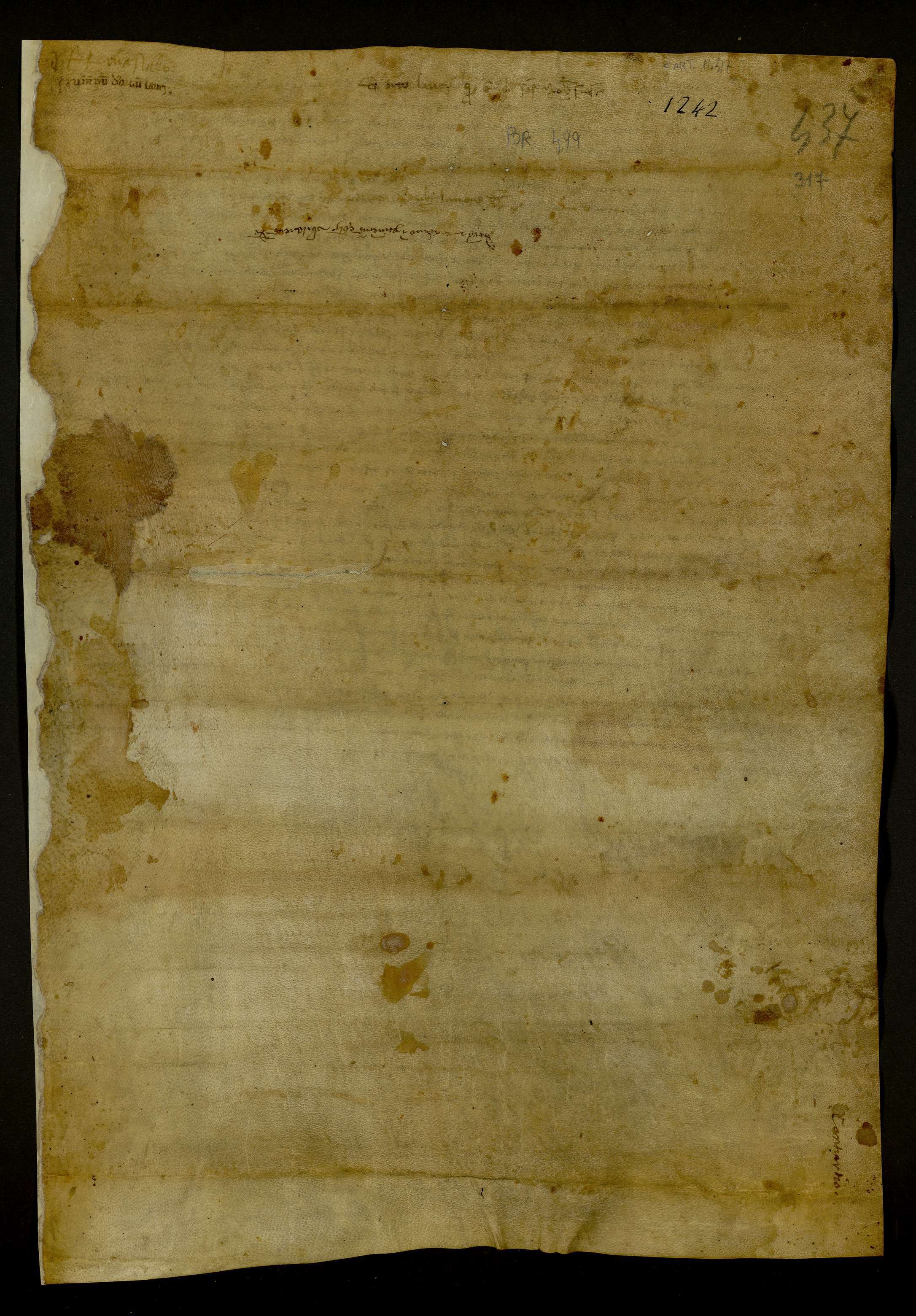 Pellegrino abate del monastero di S. Maria Nova, fa redigere copia autentica di un istrumento del 1226, marzo in cui fra’ Onofrio precettore dell’ospedale di S. Giovanni in Eboli vende al giudice Giovanni di Contursi, abitante nella città di Palermo, una terra laboratoria con alberi fruttiferi e un giardino egualmente con alberi fruttiferi alla località Laneo, appartenuti a Riccardo Frunzo, per 19 once e mezza d’oro al peso di Salerno. Roberto Malfrido, notaio.
