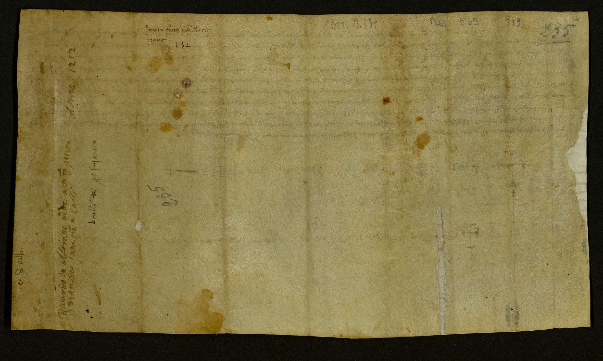 Con il consenso della moglie Bianca, Riccardo di Alferana del fu Riccardo vende al magister Petrone di Donadio per un’oncia e mezza d’oro al peso generale una terra laboratoria alla località Calli, confinante con la via del castelluccio di S. Maria del Castello e una terra del monastero di S. Maria Nova di Calli. Goffredo Mantegna, notaio.