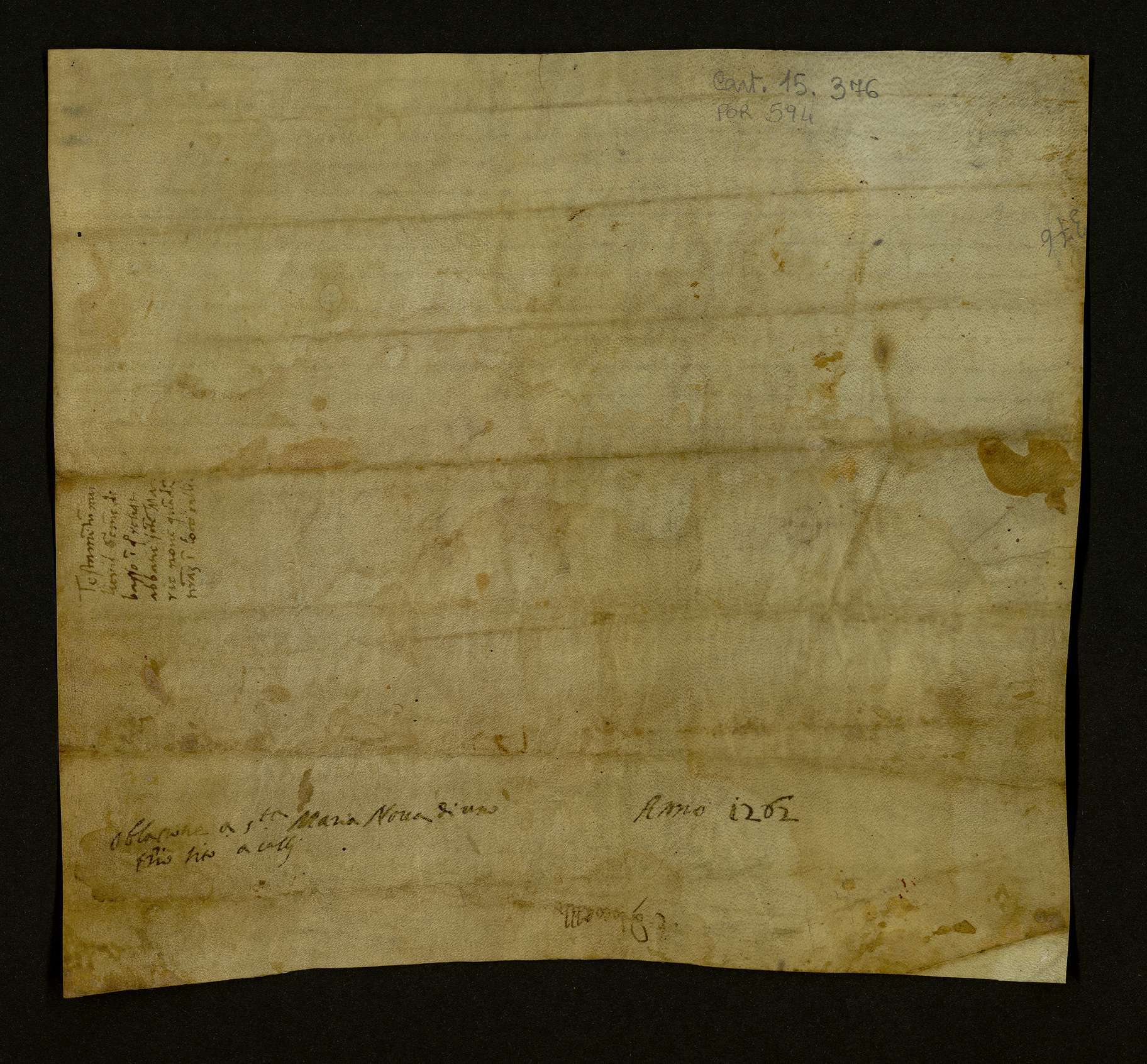 Accompagnati da fra’ Pellegrino monaco di S. Maria Nova di Calli, Filippo di Arnaldo, Bernardo Potifredo e Nicola di Agapito testimoniano che Gemma di Basso, assistita dal nipote Giacomo di Basso in qualità di mundoaldo, aveva lasciato al predetto monastero una piccola terra laboratoria alla località Calli. Nicola Troiano, notaio.