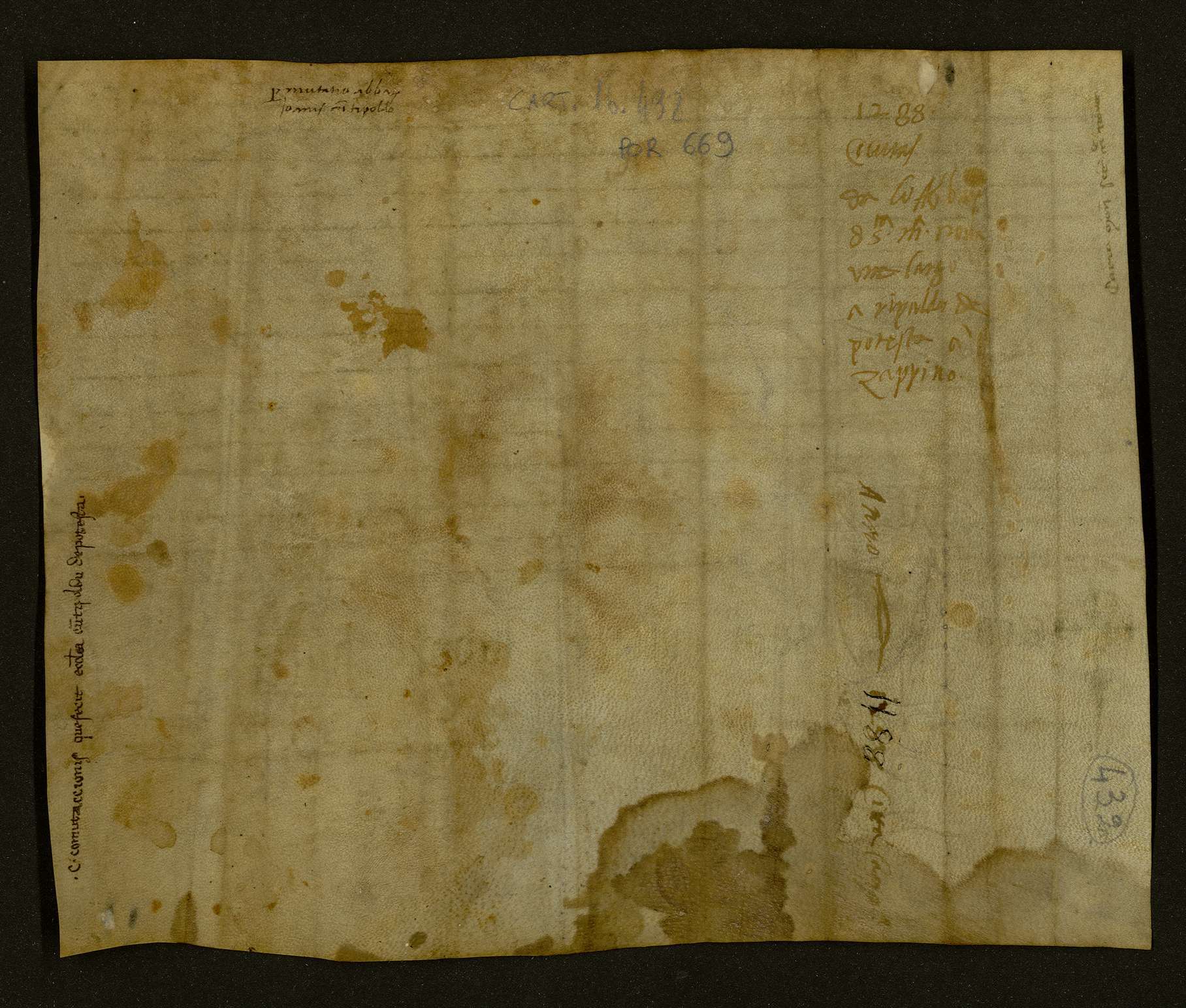 Giovanni abate di S. Maria Nova di Calli dà a Tipoldo, figlio del fu Ruggiero di Potesta, una platea nel casale Zappino e in cambio riceve la parte dello stesso Tipoldo di un pastino, posseduto in comune alla località Troncito, del valore di 24 tarì d’oro. Imperato, pubblico notaio