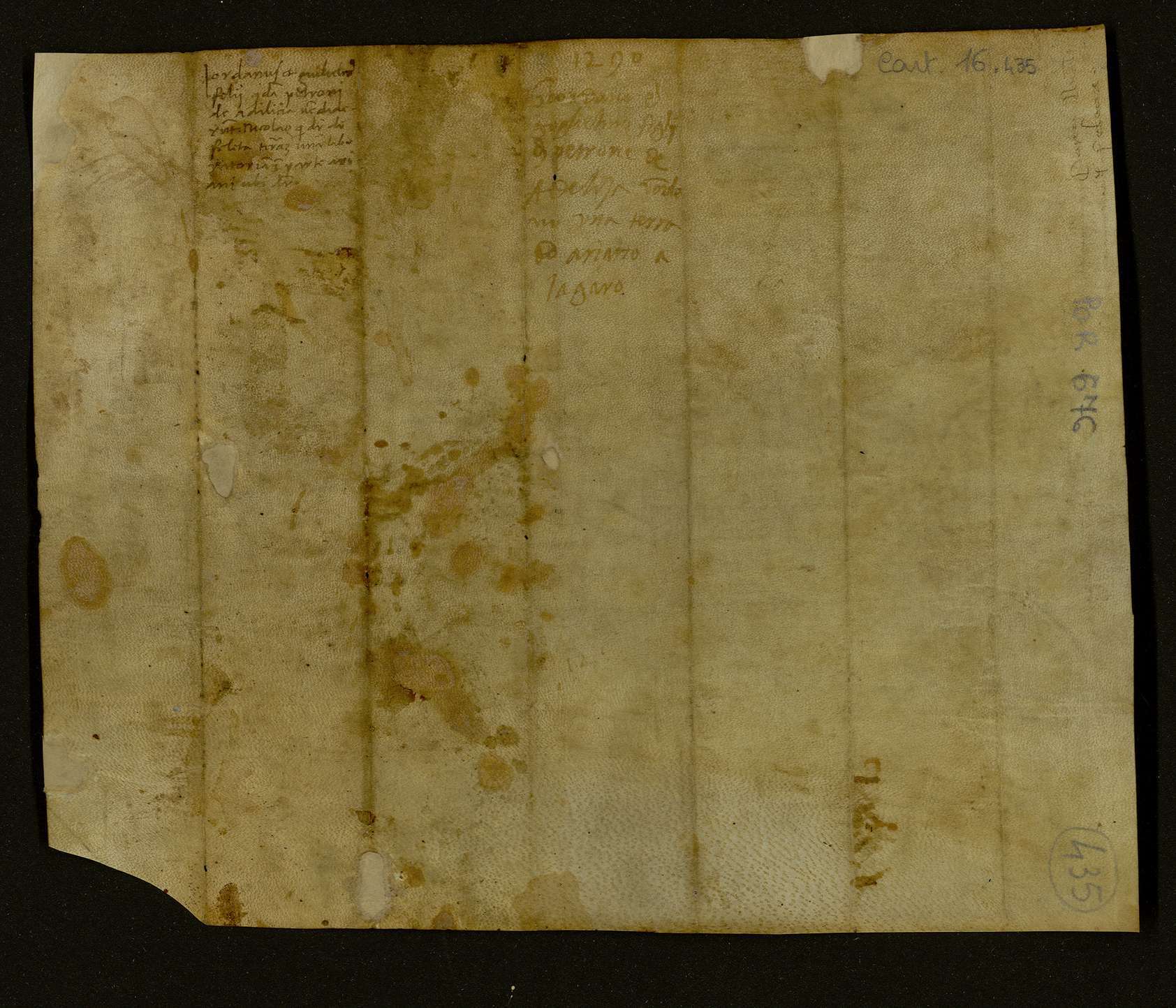Giordano e Guglielmo, figli del fu Perretta di Adeliza, vendono a Nicola di Filetta una terra laboratoria alla località Lagaro di Ariano per 24 tarì. Imperato, notaio.