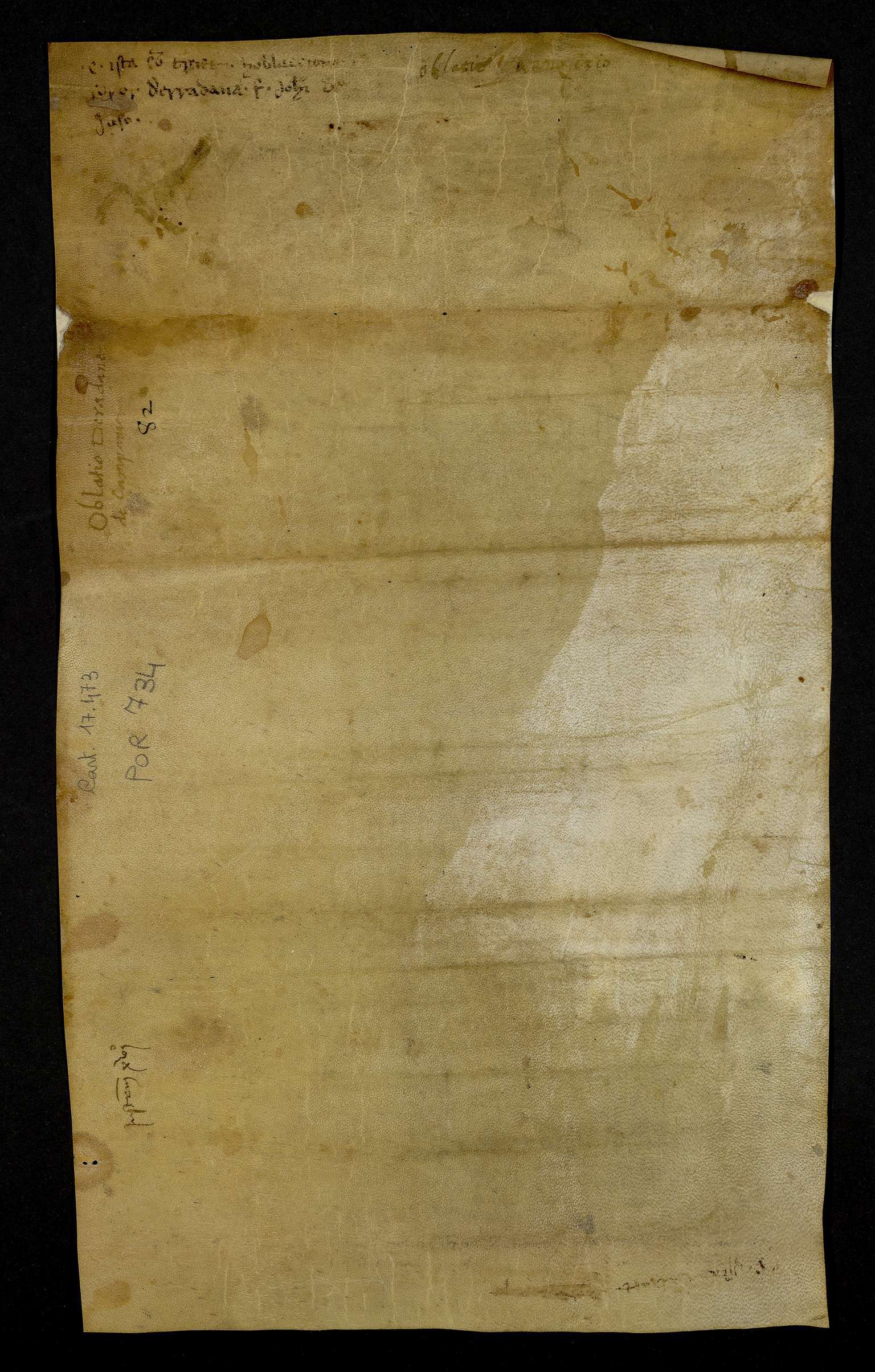 Assistita da Matteo di Cennamo in qualità di mundoaldo, Derradana figlia del fu Giovanni di Aviso offre a Dio ed alla beata vergine Maria se stessa ed alla chiesa di S. Maria Nova della località Calli del tenimento di Campagna, nelle mani dell'abate Giovanni, tutti i suoi beni mobili ed immobili costituiti da: una casa con solario e catodio nel casale Zappino, una terra con olivi alla località Fornillo di Furano e 2 once d'oro. Roberto di Imperato, notaio