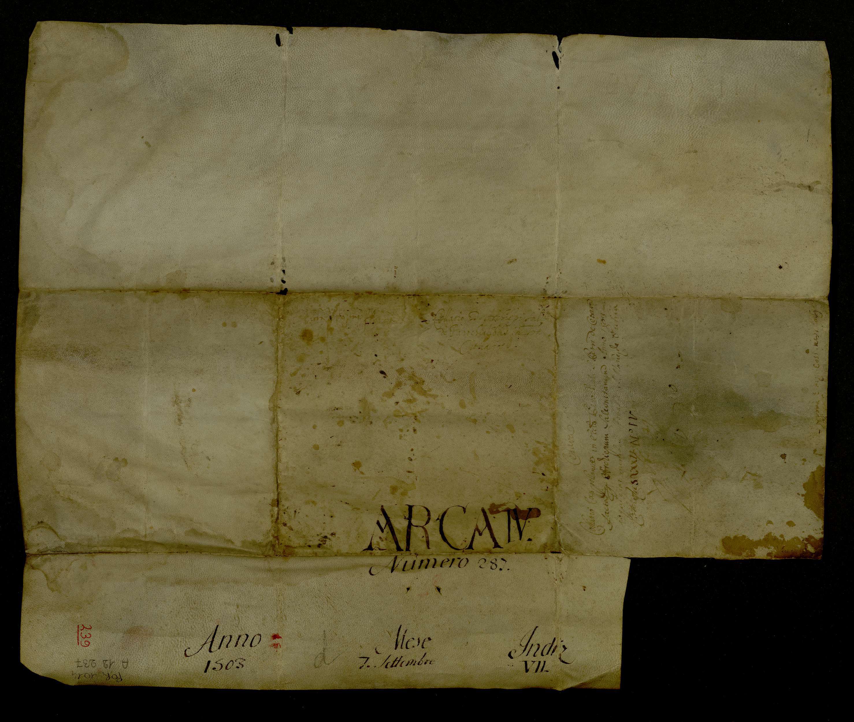 Bolla di Nicola Boerio, vicario generale dell' arcivescovo di Salerno Giovanni de Vera, che conferisce a D. Fiorentino Cimino di Cetara la metà della cappellania di S. Nicola e la metà della chiesa parroccciale di S. Pietro dello stesso paese, dipendenti dalla Badia di S. Maria di Erchie, annessa alla chiesa di Salerno. Luigi Aurofino, notaio